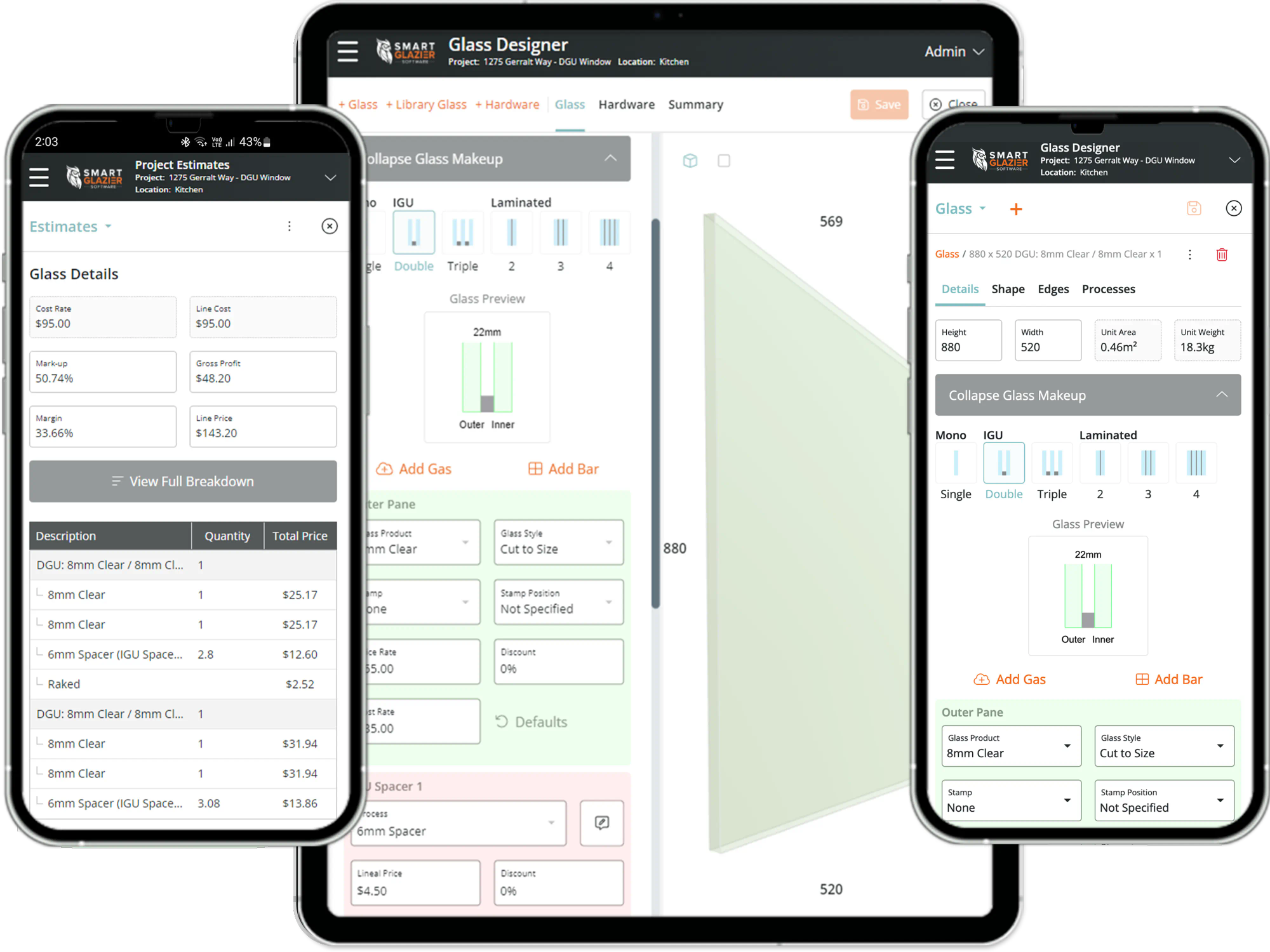 Designing your glass projects with our industry-leading software cuts rework and speeds up quoting with: